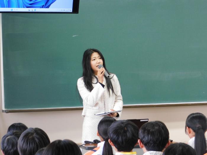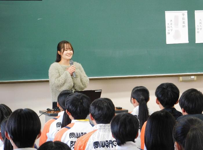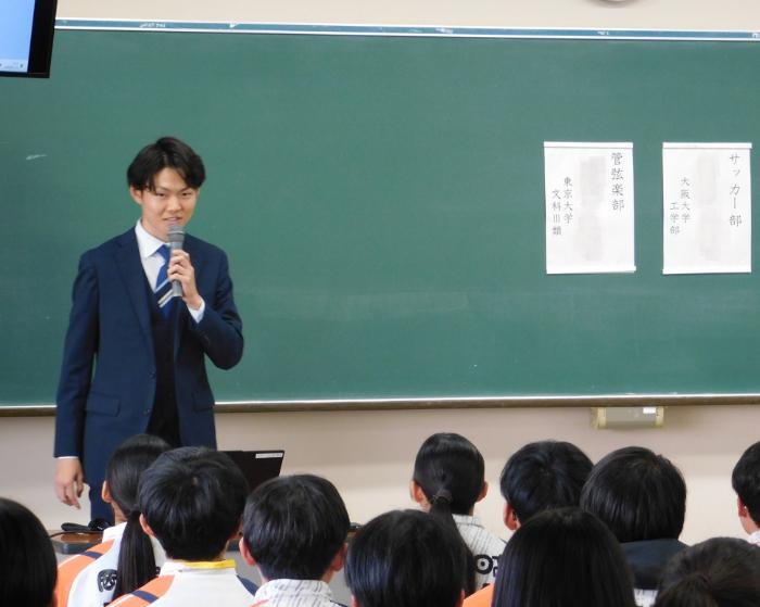 令和8年1月10日(土)学業にも部活動にも力を注いでいた卒業生を講師としてお招きし、文化部・運動部合同進路講演会を行いました。現在部活動をしている在校生190名と保護者52名が参加しました。参加者は、先輩方の成功談や失敗談を熱心に聴講しました。