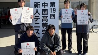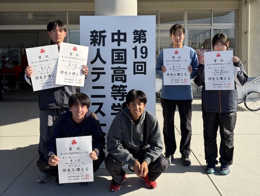 <テニス部>第19回中国高校新人大会(個人) 2025 年 11 月 16 日 最終更新日時 : 2025 年 12 月 26 日 県予選を勝ち抜き、11月15・16日に宇部市中央公園テニスコート(山口県宇部市)で行われた中国新人大会に、男女揃って出場しました。男子はシングルスで第5位、ダブルスで第3位、女子はシングルスで第2位、ダブルスで第5位という結果を残しました。男女とも、それぞれが持っている力を遺憾なく発揮して結果を残し、よい思い出となる有意義な経験ができました。