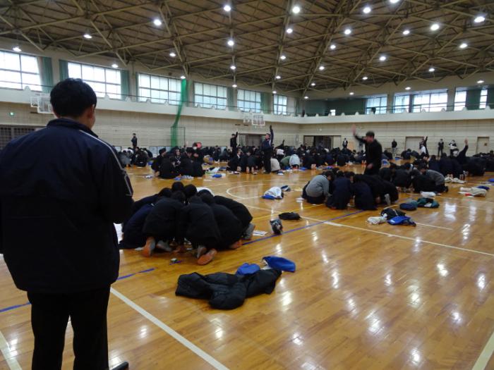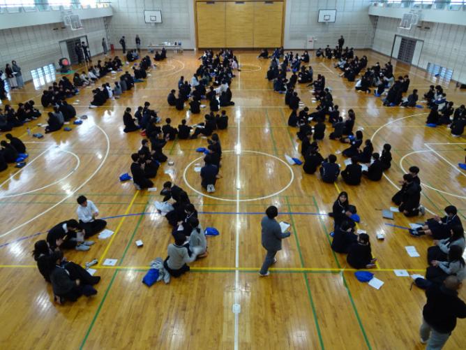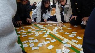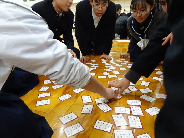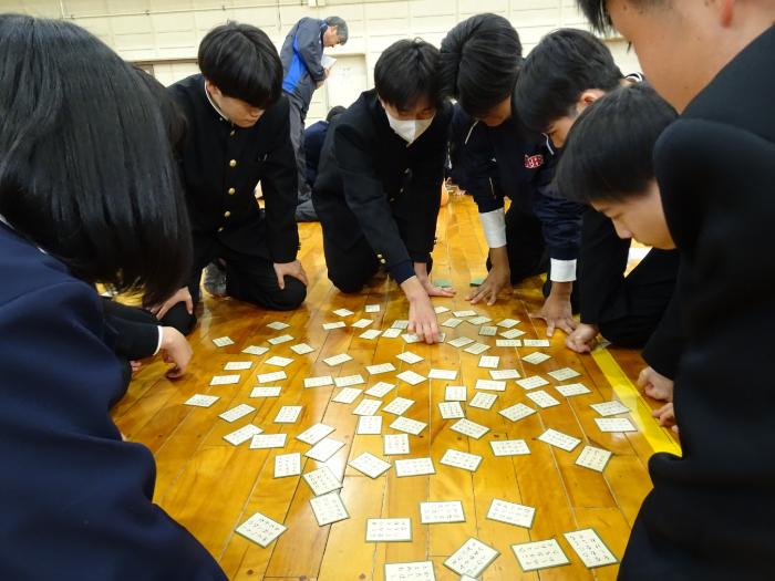 1月15日、本校体育館にて、1年生全クラスによる百人一首大会が行われました。各クラスで5名程度の班を作り、班同士での対戦をしました。対戦は2回行われ、それぞれ取り札を囲みました。