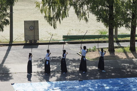 開会行事は、中庭広場を会場に、ダンス部演技、生徒会副会長による開会宣言、校長挨拶、生徒会長挨拶、空手部による演武、弓道部による演武、書道部による席上揮毫、管弦楽部による演奏、が行われ、会場を沸かせました。生徒会長は、今年度の朝日祭のテーマ「黎明〜跳べ!朝日を超えて〜」に込めた、新しい時代を自分たち自身で切り拓いていこうという思いを述べました。