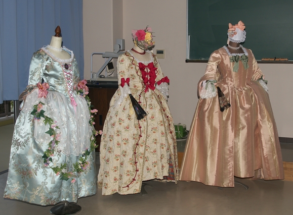 湯浅氏は,ロココ等の衣装を復元されており,数十着のうち,女性の宮廷衣装と劇場用衣装を3着持参していただきました。 |