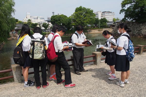 本校社会科教諭の後神 泉先生を講師に,図書館教養講座「朝日高の旧校地を巡る」を開催しました。午前9時に歴史に興味ある6名の生徒が校門付近に集合し,先生の解説を聞きながら岡山藩学校跡(現岡山中央中学校)まで,熱心に旧校地を巡りました。